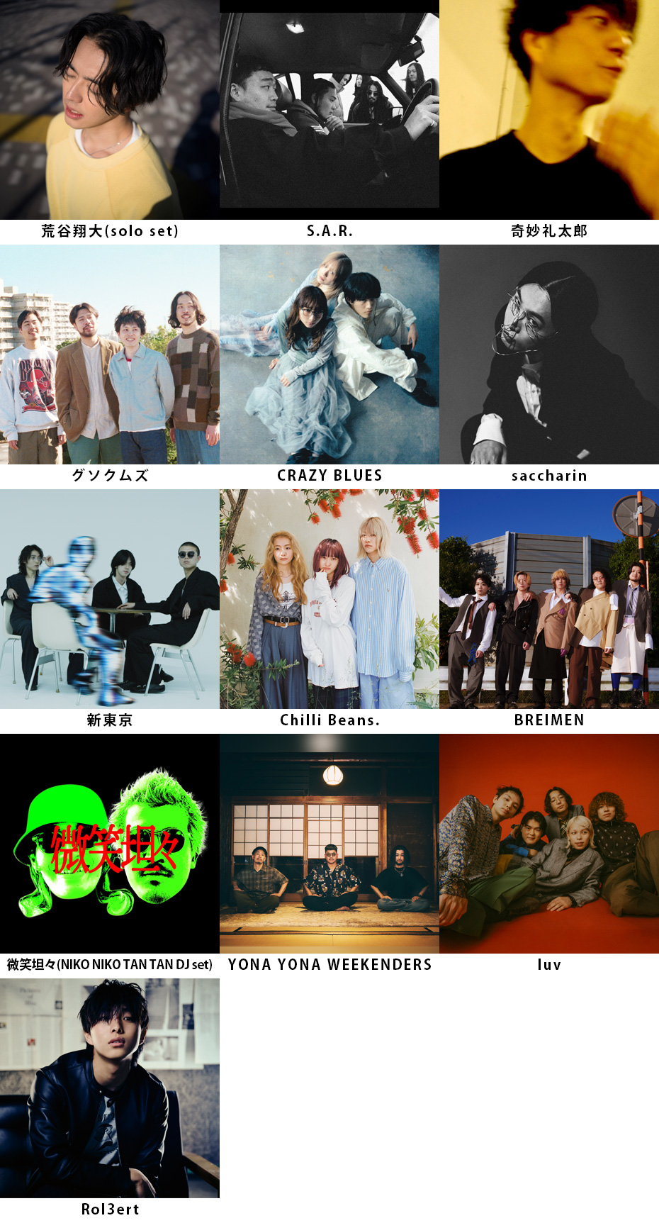 荒谷翔大(solo set) / S.A.R. / 奇妙礼太郎 / グソクムズ / CRAZY BLUES / saccharin / 新東京 / Chilli Beans. / BREIMEN / 微笑坦々(NIKO NIKO TAN TAN DJ set) / YONA YONA WEEKENDERS / luv / Rol3ert